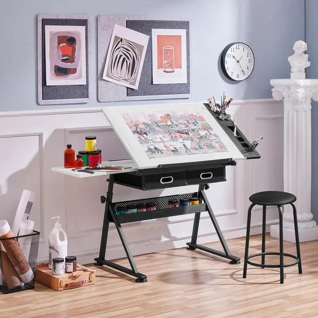 Handy and Organized Storage: This art desk features all you need for art/office stationery storage- a detachable tabletop side tray with separate slots for different stationery items; 2 fabric drawers for out-of-sight storage; and an extra open shelf down below for paper rolls and paint cans
