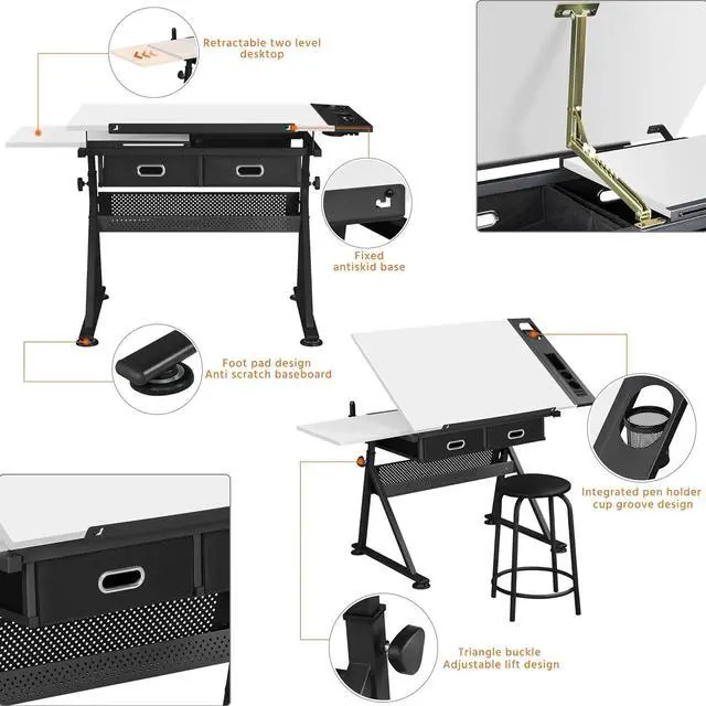 Slide-out Side Top: A 60 x 38 cm/ 23.6 x 15 surface on the left can be pulled out for placing laptop or tablet to display pictures as drawing references, or extra storage space for palettes, documents, etc. Better yet, it can be slid under the main tabletop when not in use
