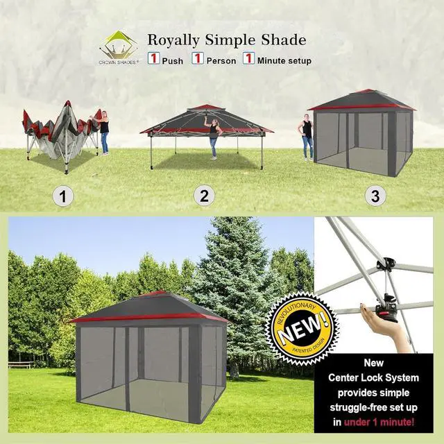SET UP]: Patented one push center lock technology central hub locks out all four legs with a single push. Then use the soft pinch-free buttons to set the leg height. Next generation canopy designed so two people can set it up in seconds with no tools necessary.
