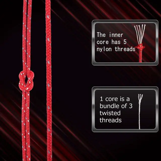 MaterialsNylon (inner) + Polyester (surface) +Reflective Cord, Combines the advantages of various materials, the windproof tent guy lines is Water, Moisture, UV, Weather Resistant, Great design for outdoor activities;