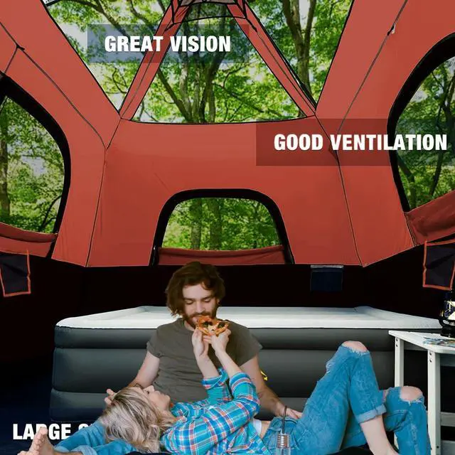 Enjoy Superior Airflow and Scenic Outdoor ViewsDesigned with 1 large mesh door, 5 mesh windows, a full-mesh tent top, and a side ventilation panel, this tent ensures optimal airflow for a comfortable nights sleep. The full-mesh inner layer allows for stargazing on warm, clear nights while staying protected under the included rainfly