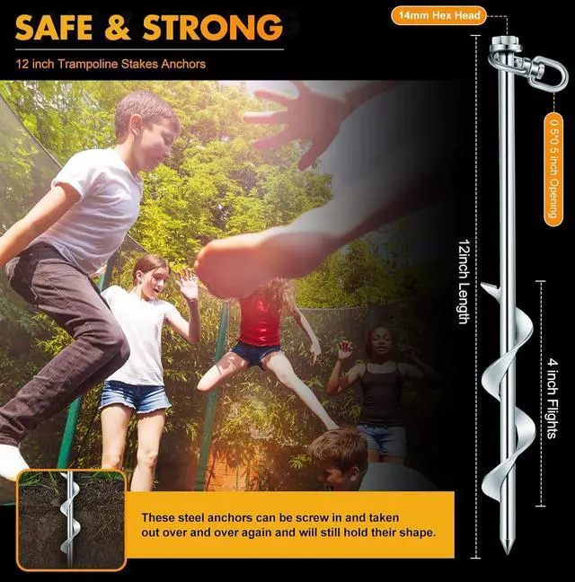 Size Information: trampoline anchors measure about 30 x 3 cm/ 12 x 1.2 inches, long enough so that you can press the heavy duty anchor hook deeply into the ground for better wind resistance