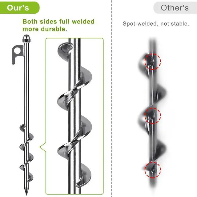 Stable and ReliableSpiral anchor pieces are 5 inches long and fully welded at the spiral connection, easily piercing hard or rocky soil and providing a firm grip for your trampoline