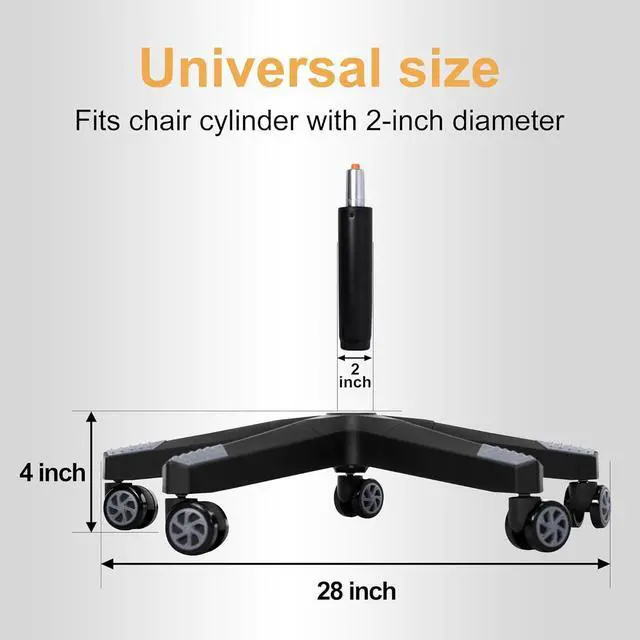 Universal size: The office chair base diameter is 28 inches, with standard center hole (2 inch), universal caster socket size (11 mm x 22 mm). Applicable to almost all gaming chairs and office chairs