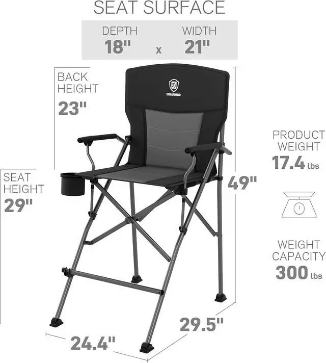 SPECIFICATIONS: Set up size of the tall camping chair is 25.8 " W x 29.7 " L x 49.0 " H, seat height is 31", and folding size is 50" H x 11.4 " L x 8.7 " W; supports up to 300 lbsweight is 14.8 lbs