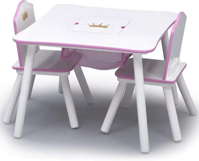 PRINCESS THEMED PERFECTION: This kids chair set with table features metallic gold crown emblems and pretty, pink trim