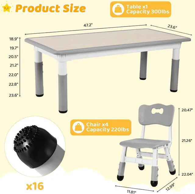 DESIGNED FOR PRACTICAL USE: Anti-slip foot covers & leg pads; To reduce wear and tear during use, kid' s chairs are equipped with 16 rubber foot covers. Legs of table are designed with rotatable foot pads, which can increase grip while also being able to cope with various uneven surfaces.