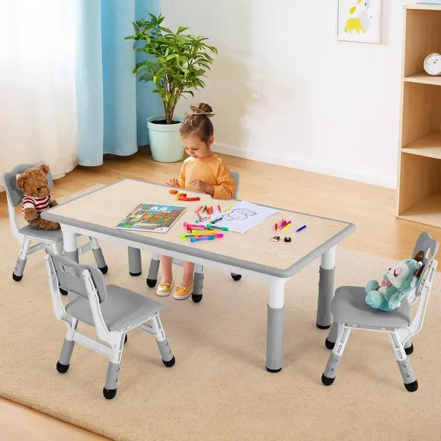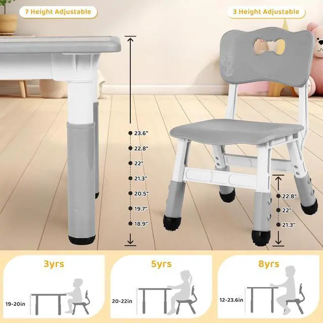 HEIGHT ADJUSTABLE TABLE CHAIR: Legs adjust in height on both table and 4 chairs. Table height has 5 levels adjustable from 18.9 inches to 23.6 inches; chairs have 3 levels adjustable from 20.8 inches to 22.4 inches. Kids table and chair set is suitable for growing child and is recommended for ages 2-10.