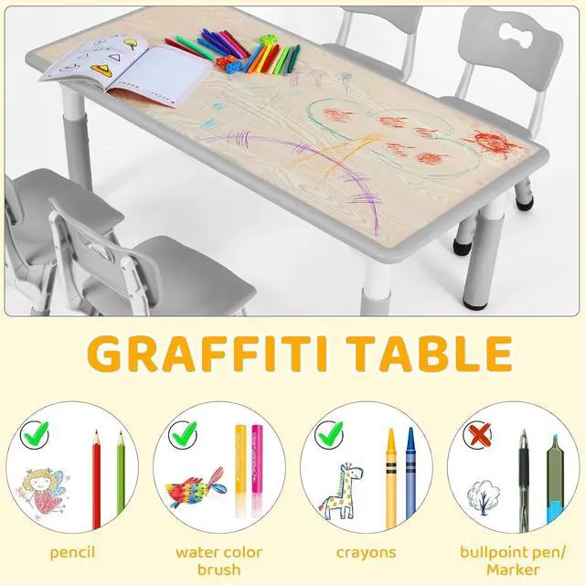 LARGE GRAFFITI TABLETOP: Toddlers can draw on table with oil or water-based paintbrushes, which can be wiped clean with a damp cloth. Table set is versatile and can be used as a desk, play table or dining table. It is suitable for places such as playrooms, daycare or tutoring centers.