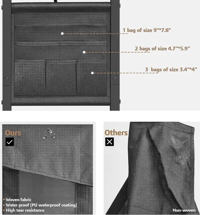 [Side Table with Storage Bag] The C shaped side table for couch has 1 large bag of 9.1 " * 8.1 " for tablet, newspapers, and magazines; 2 intermediate bags of 4.5 " * 5.5 " used for small notepads; 3 small cloth bags for temporary storage of remote control, mobile phone and charger while saving your space.