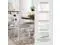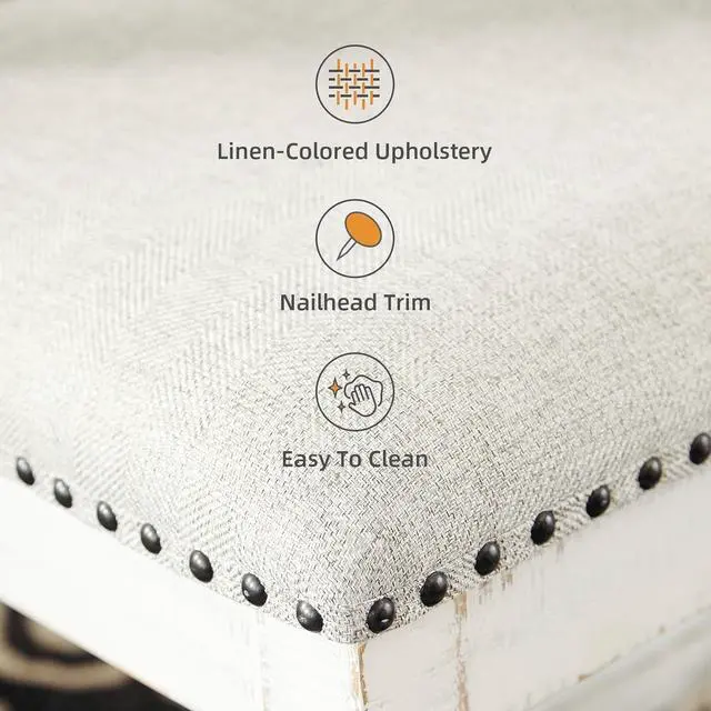 UNIQUELY CRAFTED: Made of solid wood with a distressed white vintage finish and a cushioned seat upholstered with a linen-colored polyester fabric accented with nailhead trim