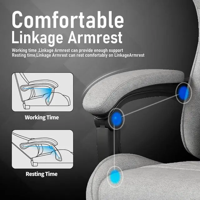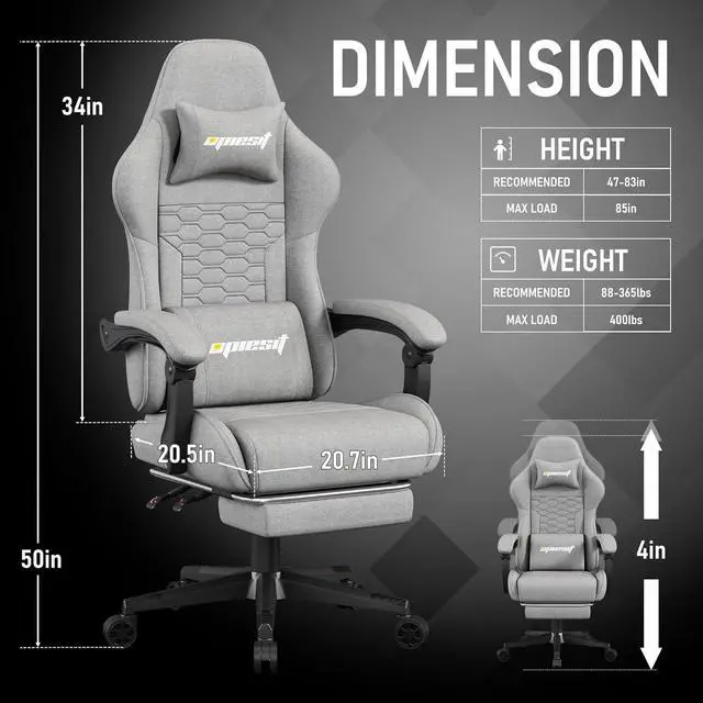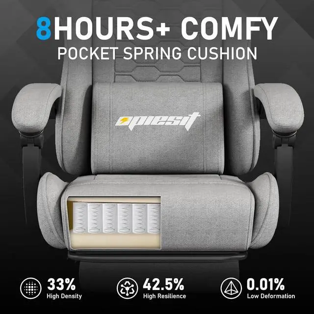 Reclining Gamer Chair---The independent pocket springs in the seat provide a sofa-like sitting experience. High-density foam adapts to your body' s shape, evenly distributes weight, and relieves pressure, ensuring a comfortable experience. When the seat is tilted, the upholstered armrest will reach a comfortable sleep state as the chair expands and contracts. The included headrest and lumbar support pillow provide additional comfort.