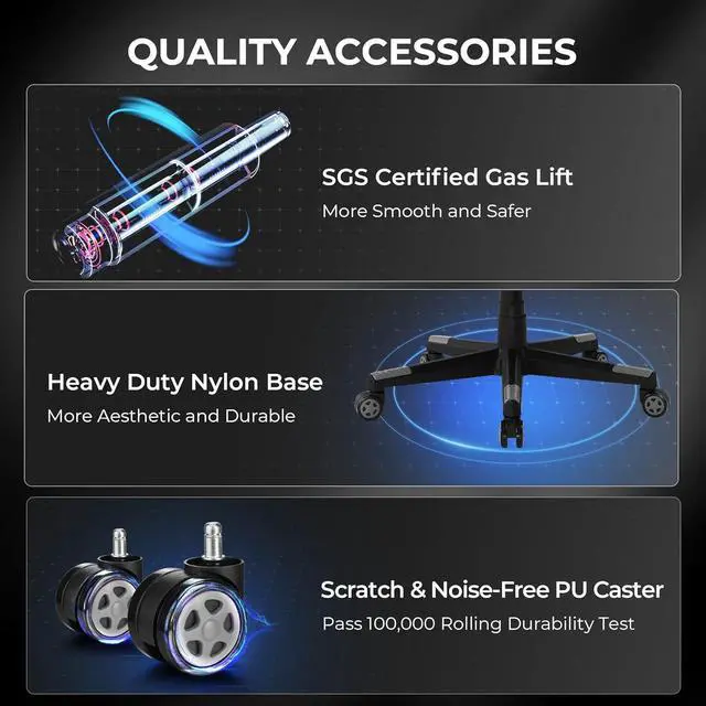 Sturdiness Assured -- We upgraded the configuration of this PC gaming chair. The rubber casters roll silently and have passed a 1000-mile rolling test. BIFMA certified heavy duty base, class 3 gas cylinder by SGS certified, it is durable and long-lasting.