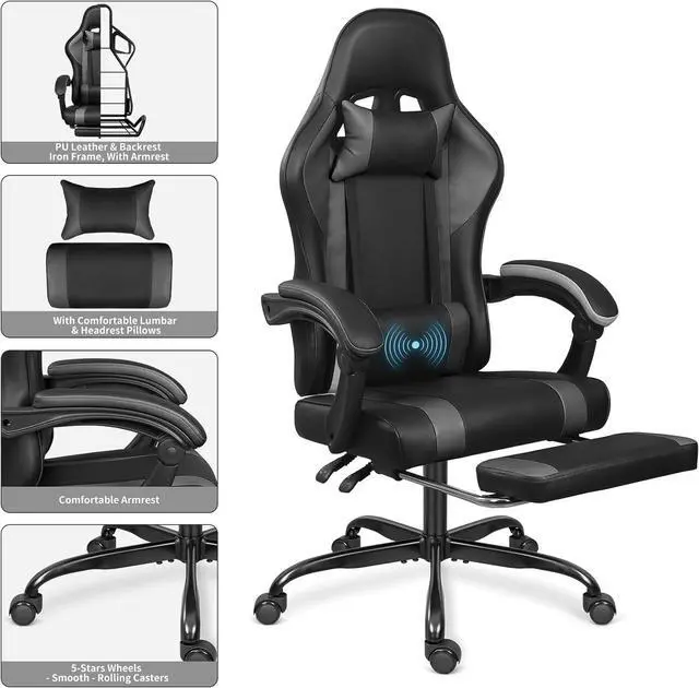 [ Adjustable Backrest ] With a 90°-135°safety angle; The second handle is the one to adjust the back, when you pull the handle up, the back will move while you lean on it, and when you pull the handle down, the back will be locked; With its reclining feature, swivel capabilities, and ergonomic design, this computer gaming chair provides the ultimate gaming experience while ensuring proper support for your back and neck