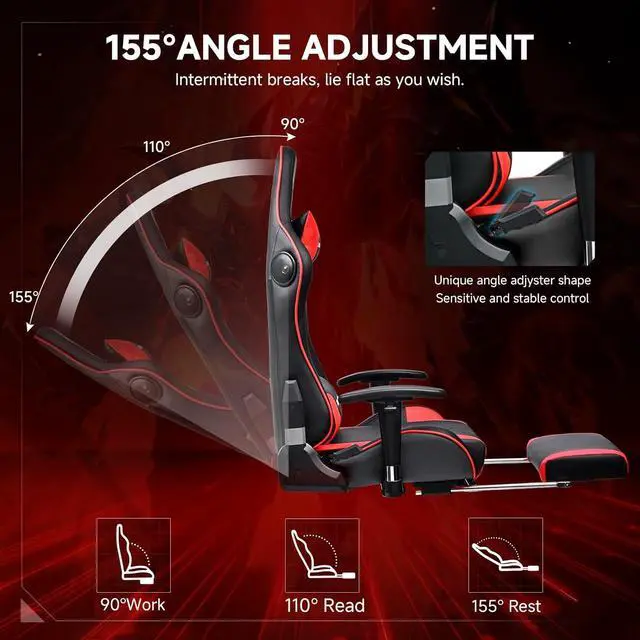 Multi FunctionEffortlessly switch between work, gaming and relaxation modes with the chairs adjustable reclining backrest. Tilt to 90°for focused work, 110° for casual gaming or recline back to 155°for a quick nap. The smooth reclining mechanism allows easy angle adjustment, while the sturdy frame ensures stable support at any position. Whether you' re deep in a competitive game or unwinding after a long day, this chair delivers exceptional comfort tailored to your needs.