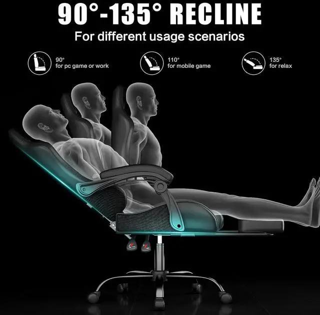 90-135 Degree Recline with Flip-Top Footrest: Backrest can be adjusted from 90 to 135 degree to meet your different needs. 90° is used to meet your pc game or daily work needs, and 110° can be used to mobile game. When you are tired, you can adjust it to 135° to take a nap. In addition, there is a flip-top footrest at the bottom of the seat to help you stretch your legs.