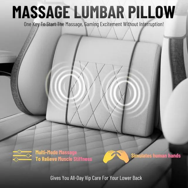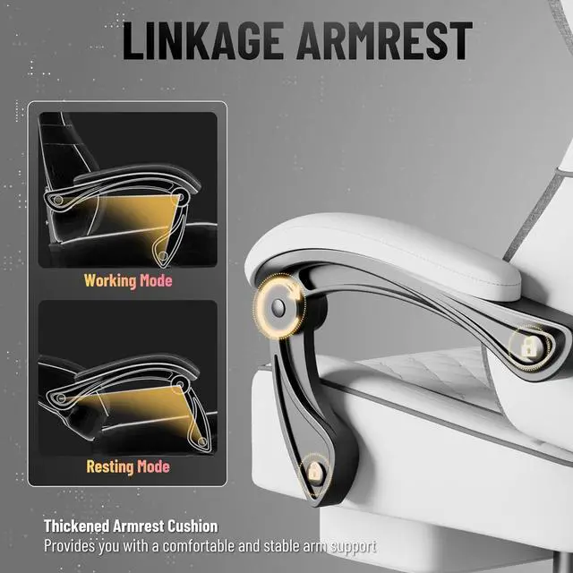 [Smart Features with Functional Enhancements] This PC chair with footrest and massage includes a USB-powered vibrating lumbar pillow to ease lower back tension. The armrests with soft cushions synchronize with your recline angle and include built-in bearings to gently support your arms. Every detail is designed to enhance your experience and comfort in any task.
