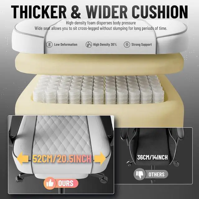 [Spacious Seat with Open-Side Design] Unlike traditional bucket seats, our wide seat gaming chair adopts a no-side-wing design, wide 20.5 -inch seat offering extra space and flexibility for posture changes. Whether you sit cross-legged or shift frequently, this open design allows unrestricted movement. Ideal for gamers or professionals who need lasting comfort without feeling confined.