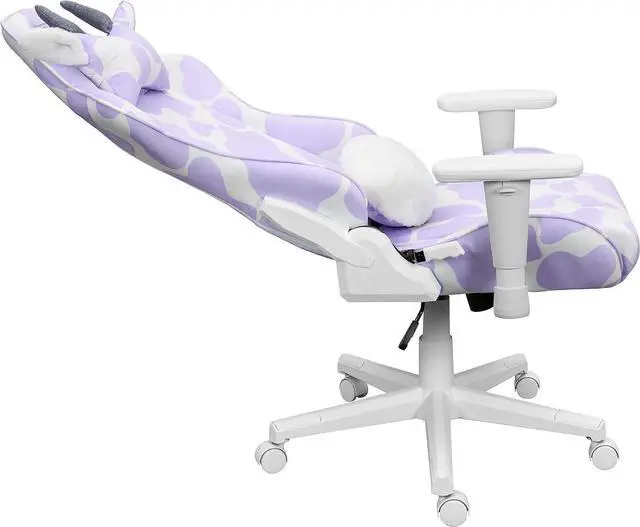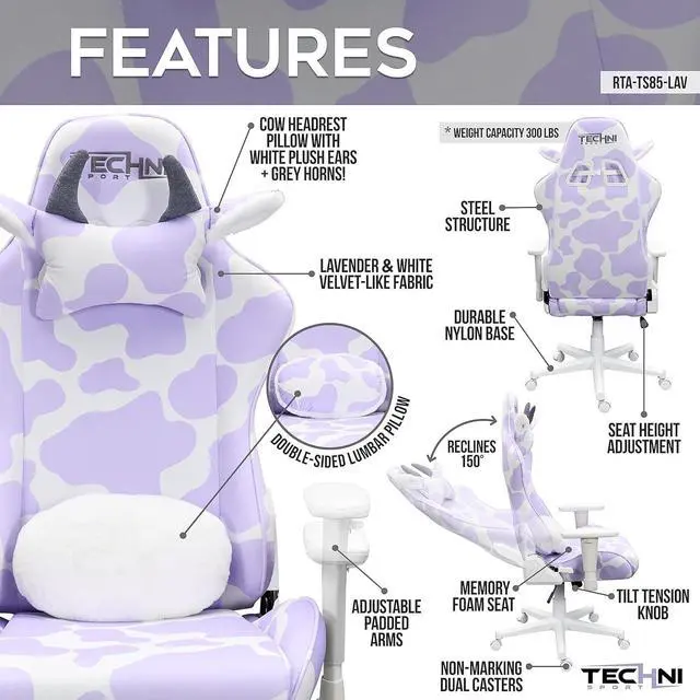 Ergonomic Design: High-density memory foam seat with lavender purple and white cow print velvet-like fabric provides exceptional comfort during long gaming sessions or workdays