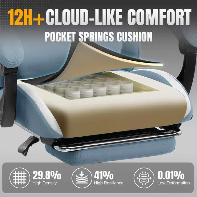 Pocket Springs: Inserted the individually pocketed springs into seat cushion. Each spring flexibly adjusts based on force points, jointly enabling precise weight distribution. Wrapped with 45D high-resilience sponge outside, it ensures no collapse during long sitting and buffers vibrations subtly. The shape and support duration are 50% longer than traditional material