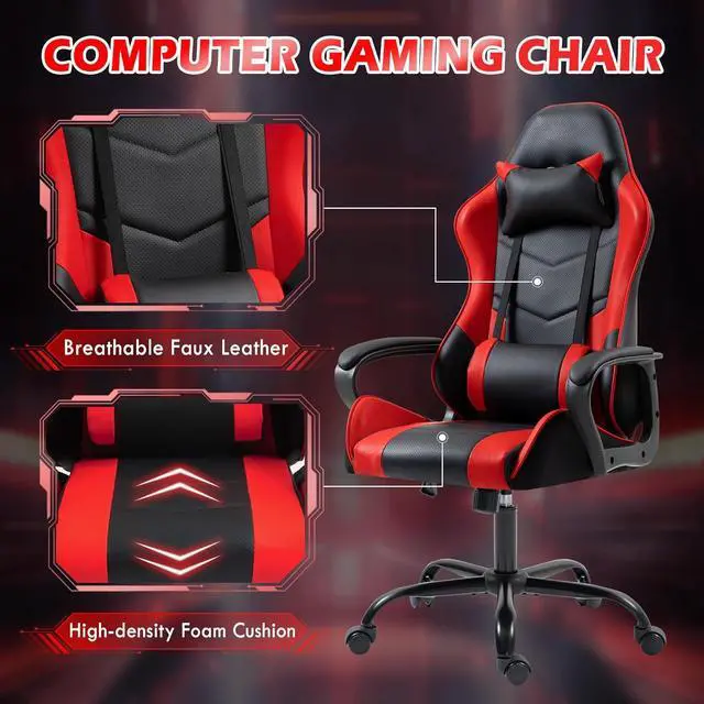 Breathable & ComfortableThis game chair features high-resilience sponge filling in the backrest, seat, headrest, and lumbar pillow, providing the most comfortable seating experience. The ventilated holes on the faux leather surface allow you to enjoy ample breathability.