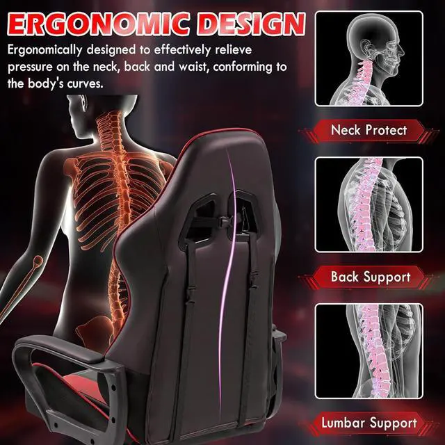 Ergonomic Massage Gaming Chair Equipped with a flexible headrest and adjustable USB massage lumbar pillow, providing comfortable support. When you experience lower back pain and discomfort from sitting in the same position, the rocking of the back can help relieve your fatigue.