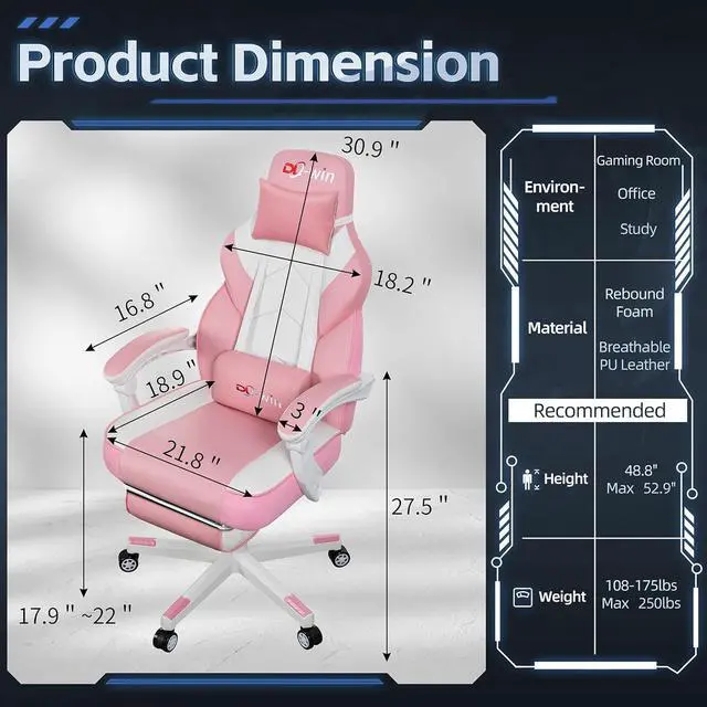 Big and Tall Gamer Chair With an overall dimensions of 26.1 " x 27.8 " x 48.8 " - 52.9 ", designed to provide for long hours of gaming or working. The seating area measures 21.8 " x 18.9 " while the high backrest measures 18.2 " x 30.9 ". The 5-jaw rollers glide quietly to protect the floor from scratches, and it' s ideal for intense gaming without the noise. Our office chairs feature 5-stage cylinders that can hold up to 400 pounds, providing you with the most stable support and safety.
