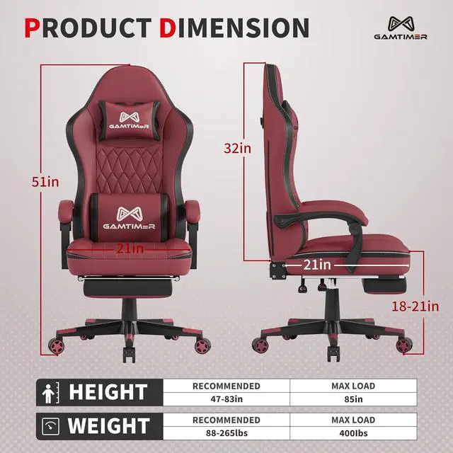 • - The gaming chair comes with a spacious seat and backrest that can hold up to 400lbs. Ideal for larger adults. Maximum dimensions are 21L * 21W * 51H inches. The ergonomic high backrest provides excellent lumbar support and fits naturally around your shoulders, head and neck.