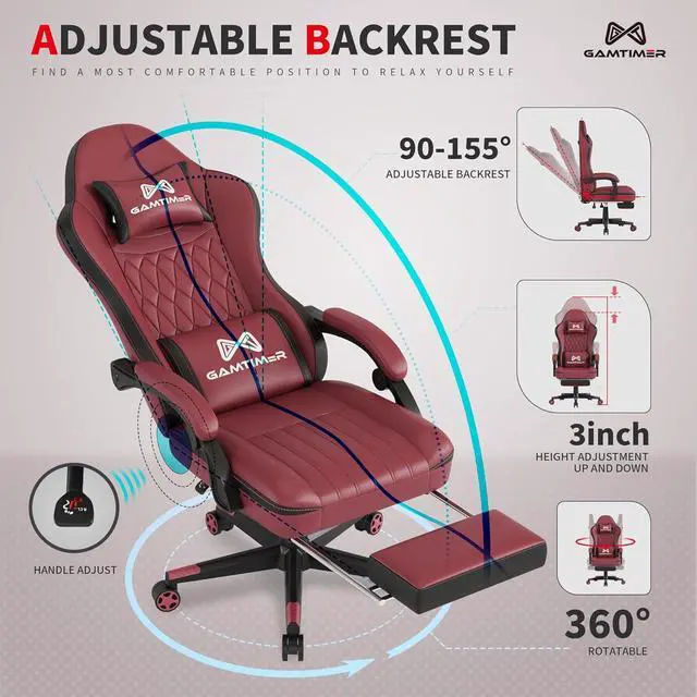 - - 360° swivelling, backrest can be reclined between 90° - 150°, suitable for work, play, reading or napping, with retractable sleeping footrest. The padded armrests retract when the seat is reclined to give you a comfortable sleeping position. It also comes with an adjustable pillow and lumbar support that protects your neck and spine, helping to relieve pressure on your neck and back.