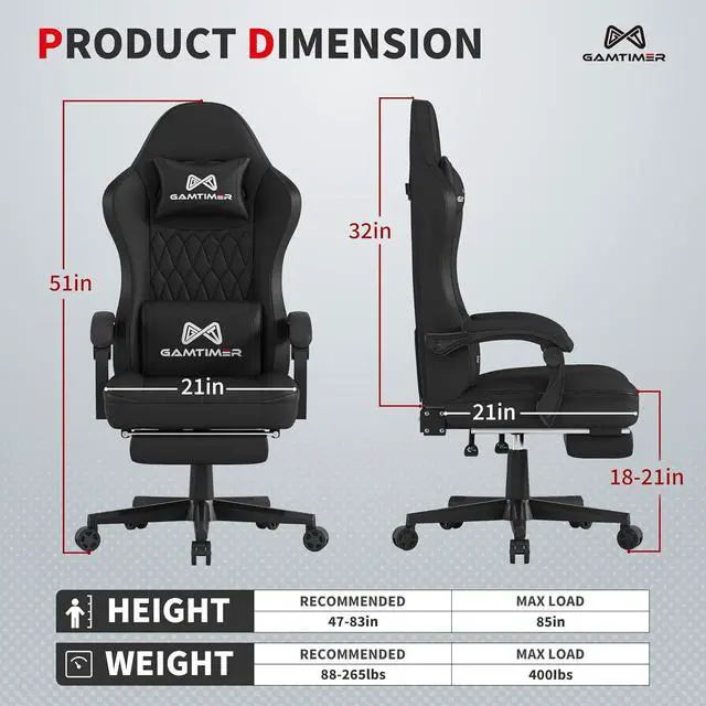 • - The gaming chair comes with a spacious seat and backrest that can hold up to 400lbs. Ideal for larger adults. Maximum dimensions are 21L * 21W * 51H inches. The ergonomic high backrest provides excellent lumbar support and fits naturally around your shoulders, head and neck.