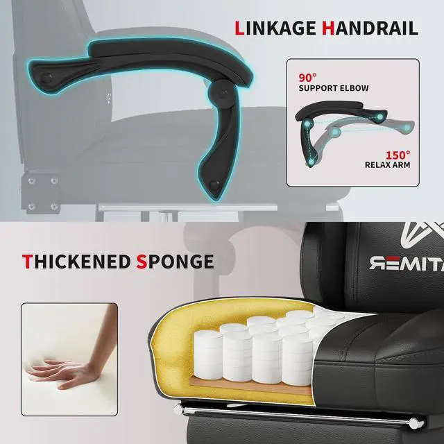 - - 360° swivelling, backrest can be reclined between 90° - 150°, suitable for work, play, reading or napping, with retractable sleeping footrest. The padded armrests retract when the seat is reclined to give you a comfortable sleeping position. It also comes with an adjustable pillow and lumbar support that protects your neck and spine, helping to relieve pressure on your neck and back.