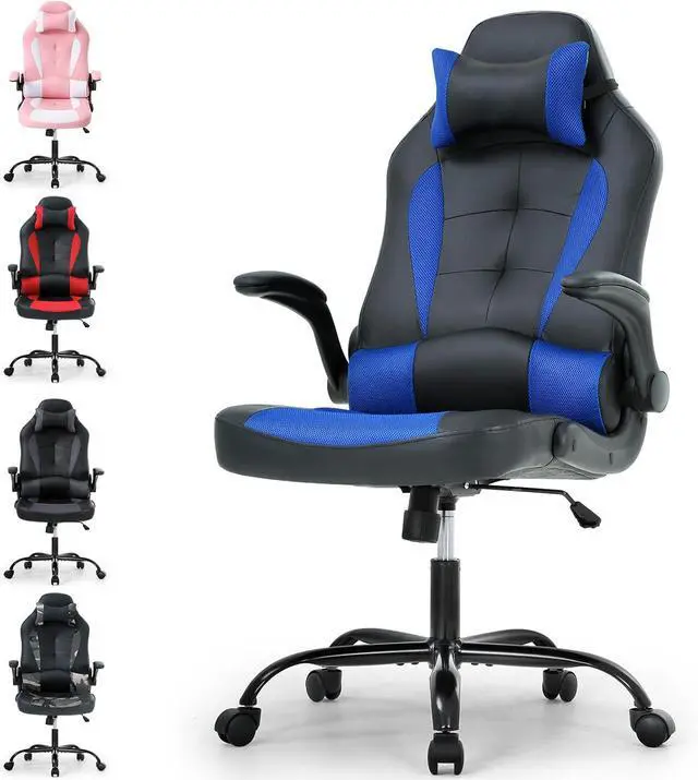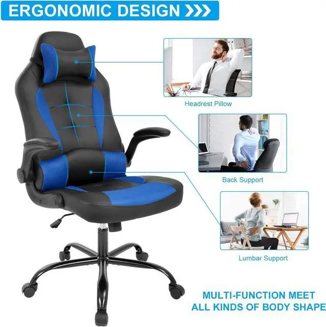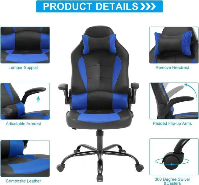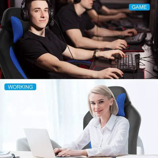 NEW UPGRADE FOR PERFECT SITTING - Ergonomic Body-Hugging design for natural curvature of a person' s back, extra high backrest with integrated lumbar cushion, no more back pain or fatigue for long time gaming or working. 360 Degree Swivel, chair back can be locked at any angle between 90-135 degree, height adjustable seat and flip-up armrest, all for finding your most comfort position.