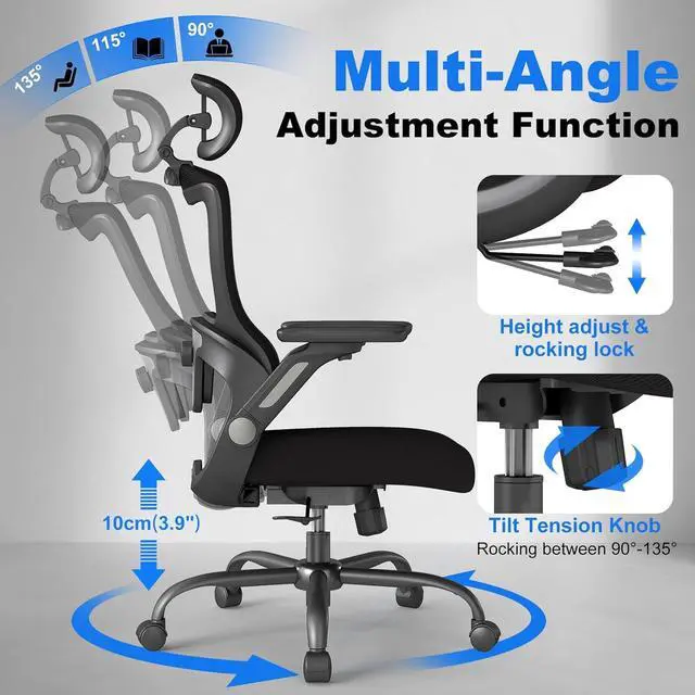 • MULTI-ANGLE RECLINING: This high back office chair offers smooth 90°-135° reclining range with 3 convenient locking positions (90°, 115°, 135°) plus a practical rear clothes hook to keep your essentials organized and wit