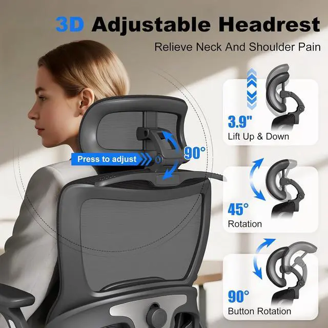 PREMIUM ERGOMOMIC DESIGN: Enjoy complete body support with 4D armrests (flip up 90°, slide 1.2 " forward/back, 2" height adjustment, 360° rotation) and 3D headrest ( 3.9 " height adjustment, 90°/45° tilt) for all-day comfort in this ergonomic office chair