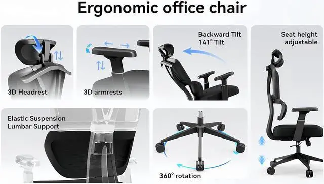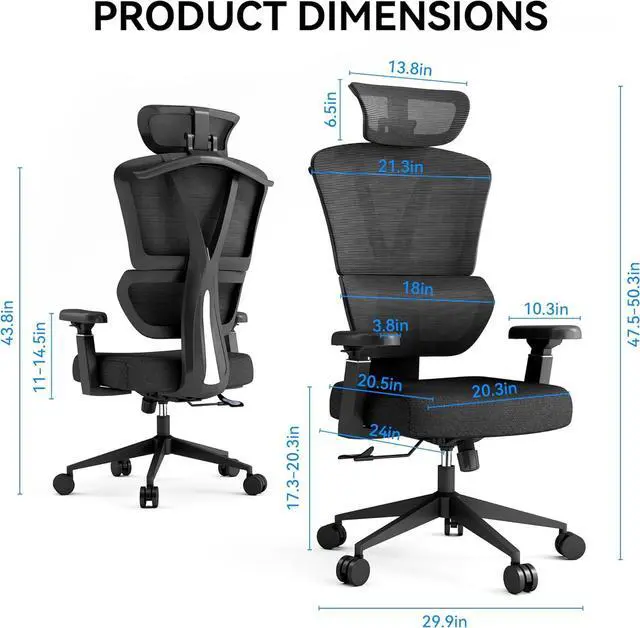 Back & Neck Support: This high back ergonomic office chair with lumbar support aligns your spine naturally. The breathable mesh back promotes airflow, and the adjustable headrest (30° tilt, 3-inch vertical) supports your neck, cervical spine, and shoulders. Ideal for home office desk use, computer work, or gaming setups.