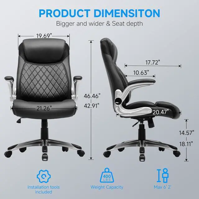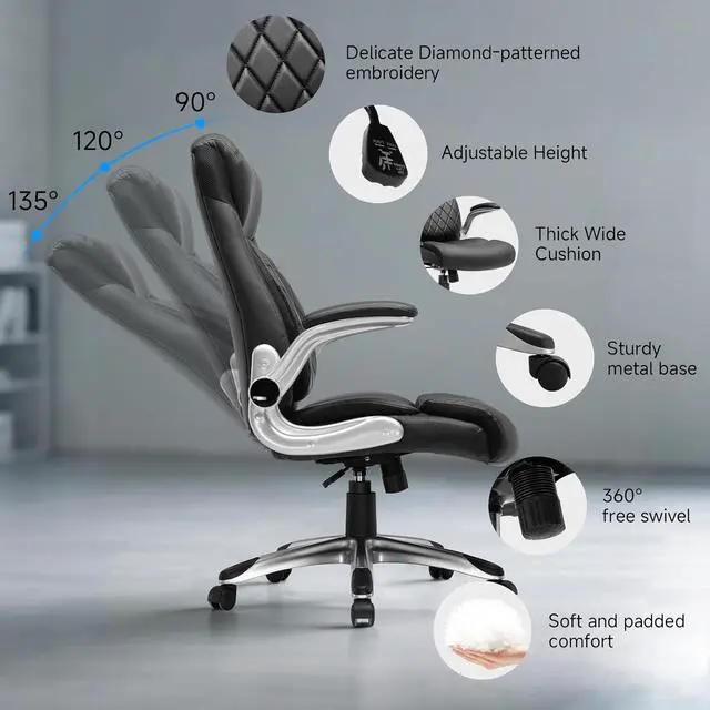 Adjustable Features: Pneumatic seat height adjustment, 20°tilt, 90° flip-up armrests, and 360° swivel. Able to rock back 135° to help you relax. With the foldaway arms, the executive chair can easily slide under a desk for space-saving. Adjustability options allow you to customize the perfect setting to fit your body comfortably.