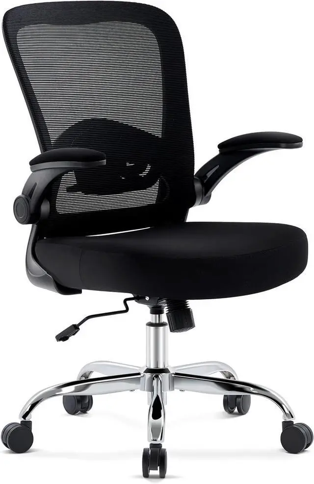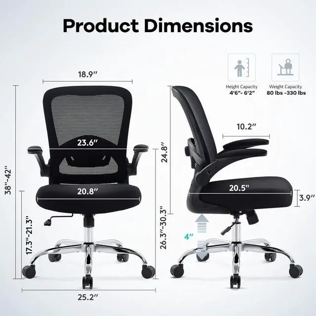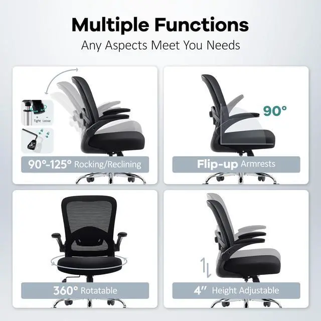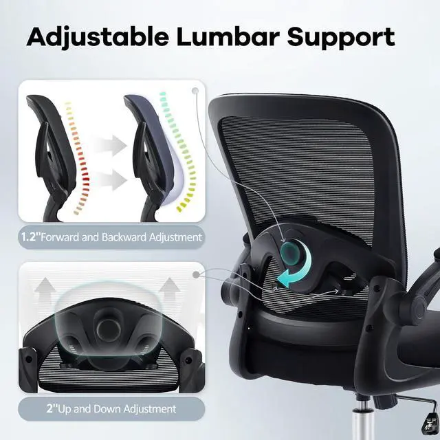Adjustable Comfort: Engineered for all-day comfort, The chair offers adjustable features such as 2" height-adjustable and 1.2 " depth-adjustable lumbar support, 360° swivel seat, 4" seat height adjustment, 90°-125° tilt/rocking function with tilt lock, ensuring a customized fit for various sitting positions and body types. Flip-up armrests provide extra space when neededideal for compact workstations or easy storage.