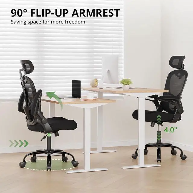 SPACE-SAVING FLIP-UP ARMRESTS: Flip the armrests up to save space and easily slide the chair under desks, perfect for compact home office setups.