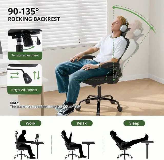 MULTIPLE ADJUSTABLE FEATURES: Customize your seating with adjustable seat height, reclining backrest (90°120°), flip-up armrests, and breathable mesh back. Designed for users 5' 2" to 6' 2" for optimal fit.