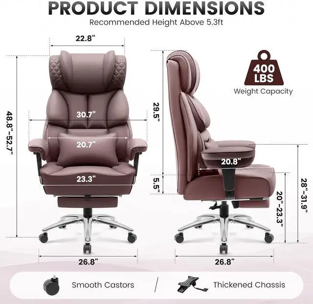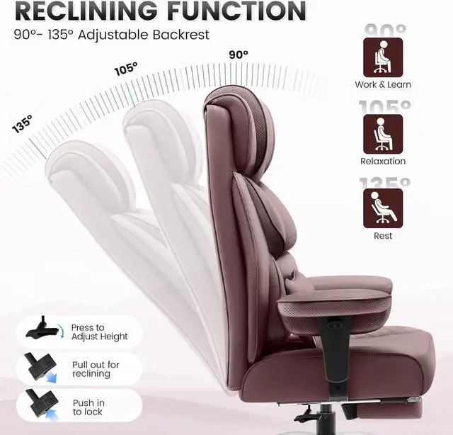 : You can effortlessly customize the seat height, backrest angle, and armrest positions with this big and tall office chair. It also swivels 360°, adapting seamlessly to various desk heights and office scenarios. Whether you' re working, relaxing, or taking a short break, the retractable footrest ensures your lower body stays comfortable, meeting all your diverse work and relaxation requirements