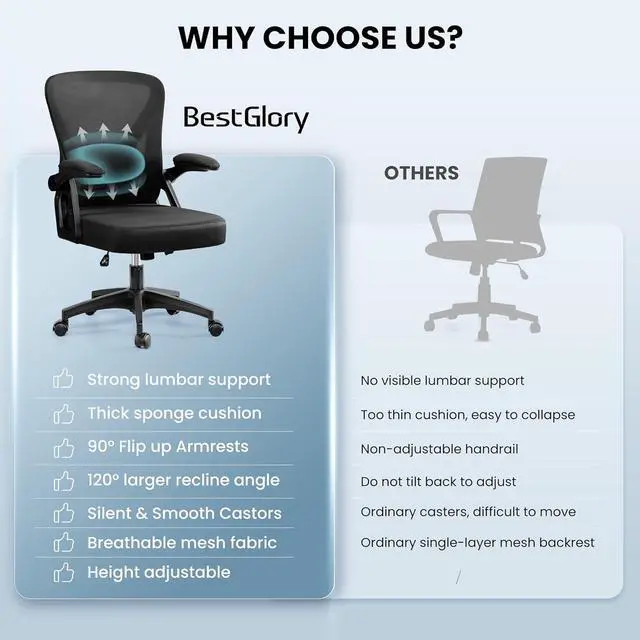 Featured by a practical lumbar support, the ergonomic office chair offer the right support, alleviating lower back pain associated with prolonged sitting. The ergonomic mesh office chair boast armrests that can be flipped up and out of the way when not needed, providing flexibility and saving space. Multiple adjustment features allow you to personalize your sitting posture;