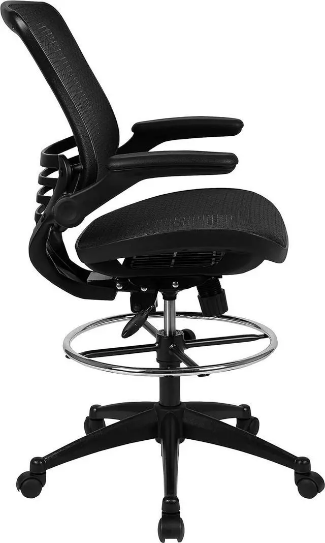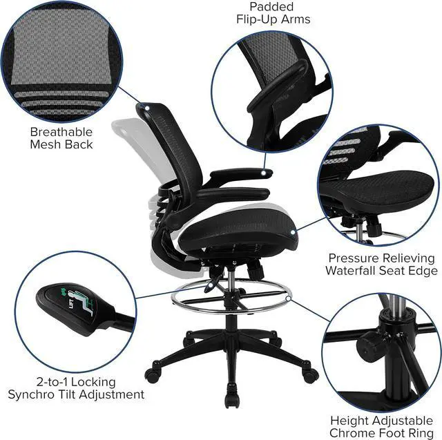FOOT RING AND ARMRESTS: Features a modernized height adjustable foot ring that ensures proper leg support at varying desk heights and padded armrests that relieve pressure off of your shoulders and neck