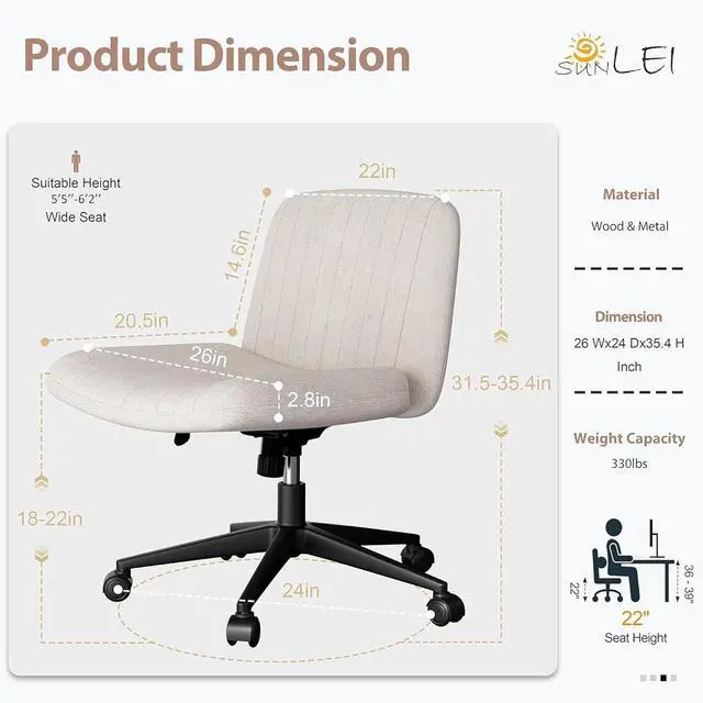 Elegant & CozyThis desk chair with no wheels has a black lacquered criss-cross aluminum base with non-slip natural rubber feet on each support leg to prevent scratches and slips. The high quality cozy fabric and stylish shell-shaped backrest is taller and wider to perfectly fit your back and release pressure, providing a comfortable sitting experience even after long hours of sitting.