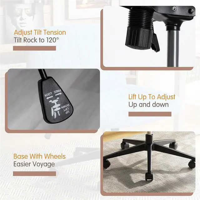 Versatile Use with WheelsThe office chair has an adjustable seat-to-floor height range of 15.94 ' ' - 19.69 ' ' to match most desks. With a 360-degree swivel angle and 108°-130° tilt angle, this spacious office chair offers the most comfortable height and angle for both office and leisure, so it is suitable for various scenarios, such as home office, living room, bedroom, dressing room, study room and so on.