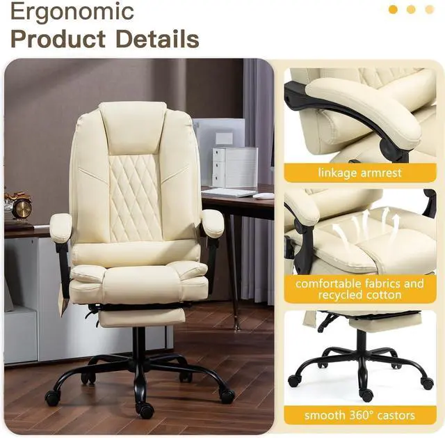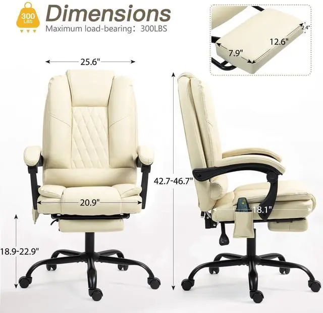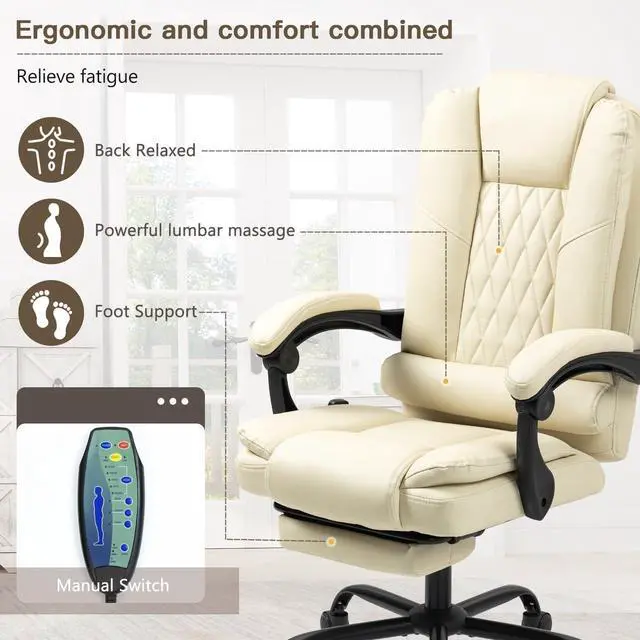 Massage & Heat Features: This ergonomic office chair with foot rest has a 6-point massage system, back, lumbar, and seat vibrations penetrate into your deep muscles, relieve fatigue. Offering a solution for those suffering from back pain caused by prolonged sitting.