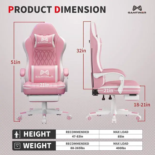 - The gaming chair comes with a spacious seat and backrest that can hold up to 400lbs. Ideal for larger adults. Maximum dimensions are 21L * 21W * 51H inches. The ergonomic high backrest provides excellent lumbar support and fits naturally around your shoulders, head and neck.