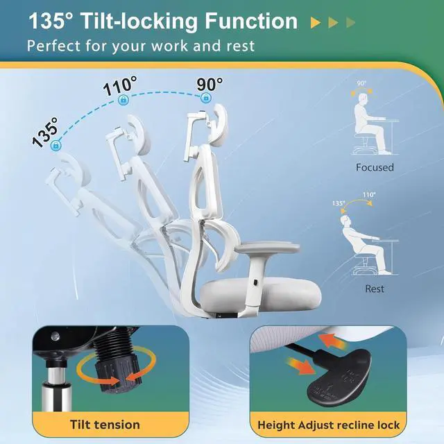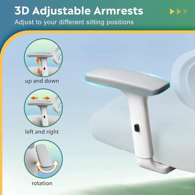 3D Adjustable Armrests for FlexibilityThe 3D armrests have a unique bounce-back design for easy height and direction adjustments. As the result, this chair is suitable for people of different heights. The seat height ranges from 18.9 to 22.4 inches, while the backrest reclines from 90° to 135°. These adjustments provide customizable seating options to reduce arm strain and maximize workspace efficiency.