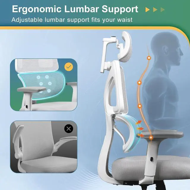 Ergonomic Support for Head, Neck, Lumbar, and ArmsThis office chair features an ergonomic backrest and a 60° adjustable headrest that contours to your neck for precise support. The adaptive lumbar support prevents lower back strain and injuries, optimizing posture to reduce neck and back fatigue. Stay comfortable and productive even during long work hours.