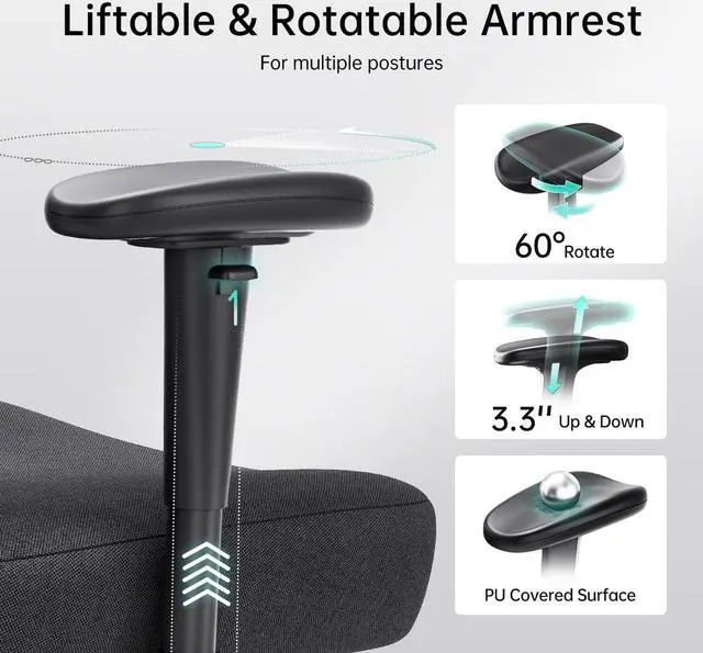 2D Adjustable Headrest: The headrest of Hbada P3 office chair allows 5.1 ' ' lifting and 30° rotating, which land perfectly where your head is and provide soft support.