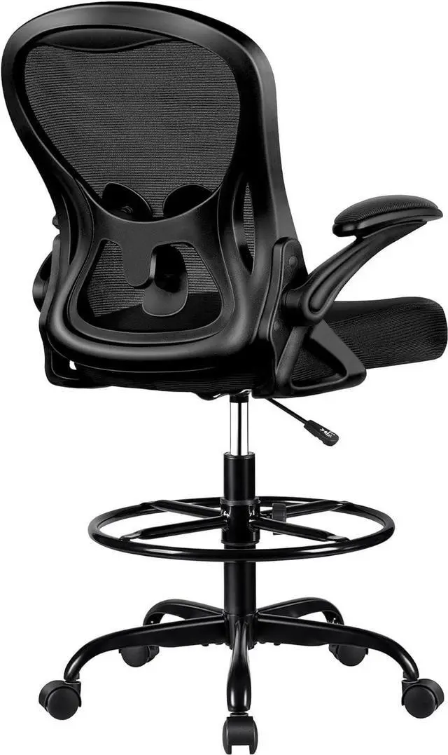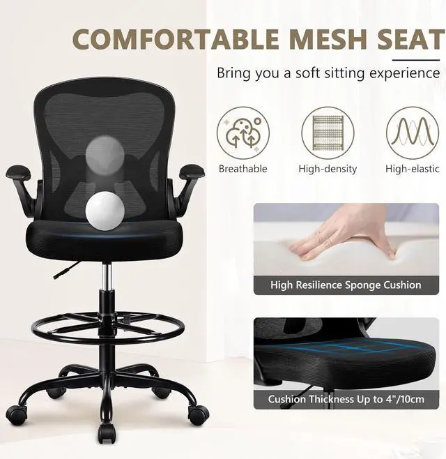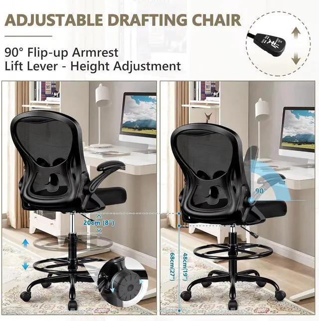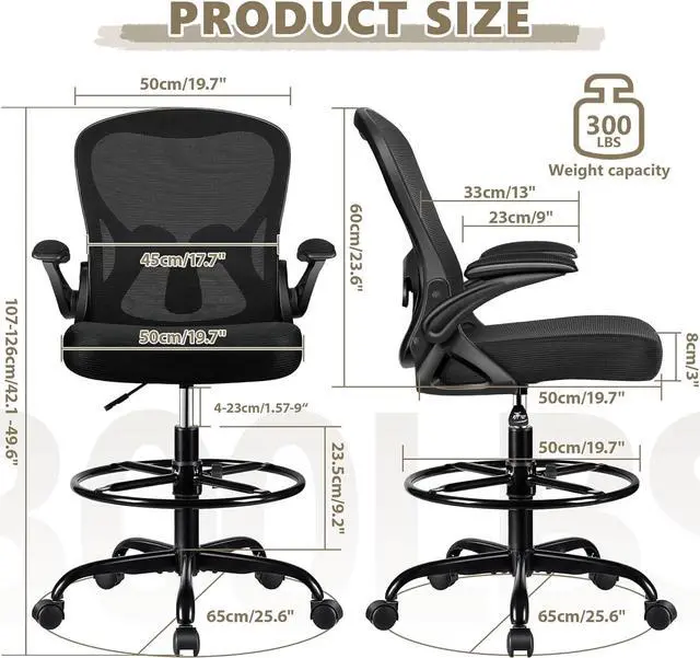 Ergonomic Drafting Chair: The backrest conforms to the curve of the human back to reduce fatigue and promote better posture. Comes with lumbar support that adjusts up and down 3cm/ 1.2 inch to accommodate people of different heights, designed to protect your spine and relieve back and spinal pain during long hours of work. The tall office chair will provide extra support for your back.
